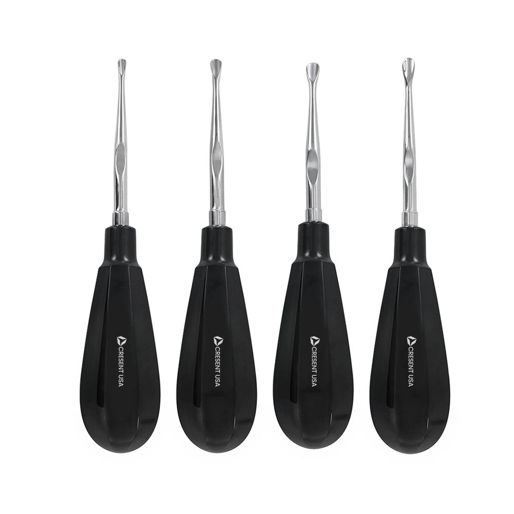 Black Line Signature Series Luxation Elevator kit includes 4 of Crescent Instruments Dental Products signature black titanium coated handle elevators. Sharp end-tip for precision cutting of periodontal ligament. Increases tactile sensitivity. Features: • Sharp end-tip for precision cutting of periodontal ligament. • Unique finger rest to reduce hand fatigue. • Signature Black Titanium Coated Handle. • Nitride Nickel Titanium Tip and Shank. • Stronger than medical-grade stainless steel.